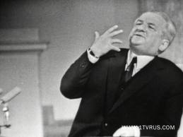 «Мы и дальше будем беспощадно бороться с проституцией (рубящий жест в сторону женщины в первом ряду), наркоманией («колющий» жест в мужчину во втором ряду) и (охватывающее движение рукой в сторону доброй четверти зала справа) – тунеядством!».